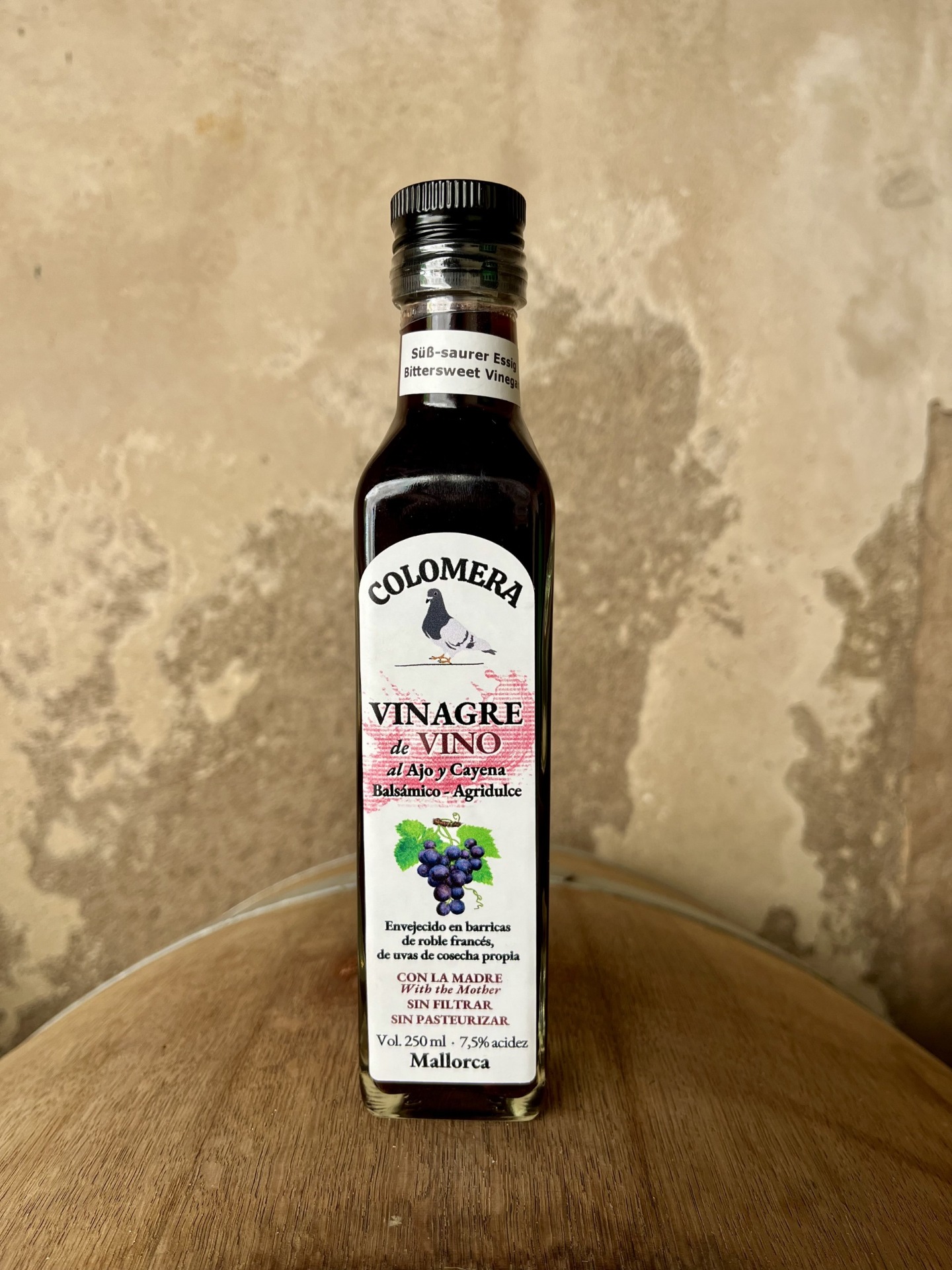 Envejecido en botas de roble francés. Con "LA MADRE". Se caracteriza por su elegante color rojo, gran vivacidad e intensidad. Un vinagre muy especial con un potente sabor agridulce macerado con cayena y ajos de nuestro huerto. Ideal para todo tipo de elaboraciones y aderezos. Aroma intenso y complejo, rico en matices herbales y especiados, con densos recuerdos a frutas rojas maduras. Paladar de extraordinario carácter y alta concentración, denso, carnoso, con finas notas tostadas. Ideal para todo tipo de elaboraciones y aderezos.
